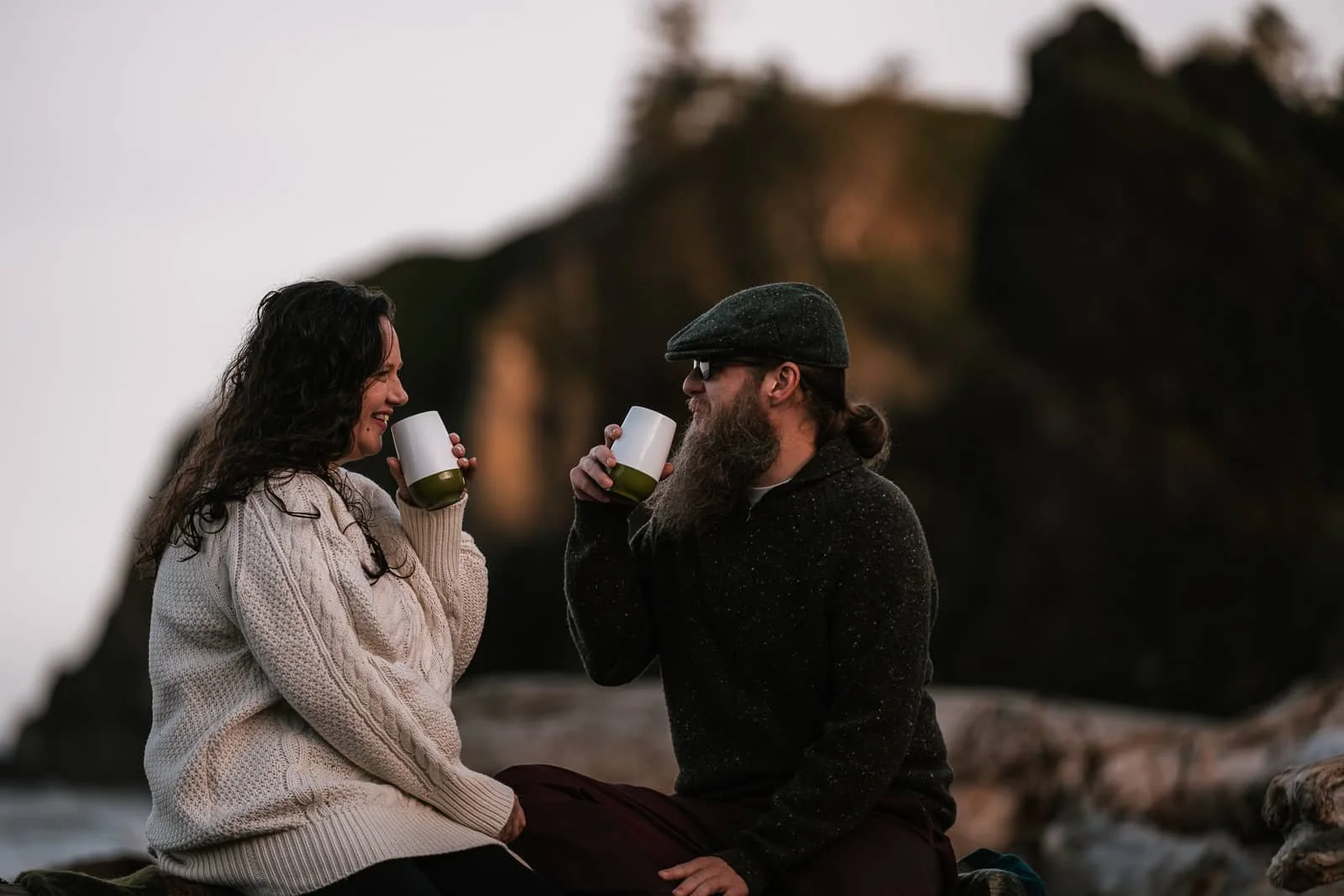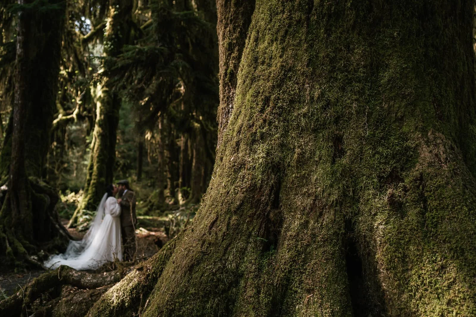at least in my opinion, is with a warm cup of coffee. Laura and Waylon decided to make it a little extra special by brewing and enjoying that cup of fresh morning joe sitting on a driftwood log as the sun rose on Ruby Beach. Not only was it a great way to get a little caffeine boost for the adventure ahead, but more importantly, it was the perfect way to set the tone for the day. When planning an elopement, I always tell couples the best thing to do is plan it like they aren’t getting married or wearing formal attire for the day. Pretend you’re on vacation and plan it with the goal of having a great time and seeing amazing places. Then work your ceremony into it, and you have an amazing adventure! That will not only mean a great time and lots of fun memories, but also incredible photos. The photos you will treasure for a lifetime aren’t the perfectly posed model-esque shots (we’ll get some of those), but the ones that show the two of you with sparkles in your eyes laughing as you jump across a patch of mud. It’s the cliche “look natural” you always hear photographers tell their subjects but made actually helpful. It can be intimidating to stand in front of the camera, but it’s hard to care as much about the camera when you’re hiking through the old-growth forests of Olympic National Park.